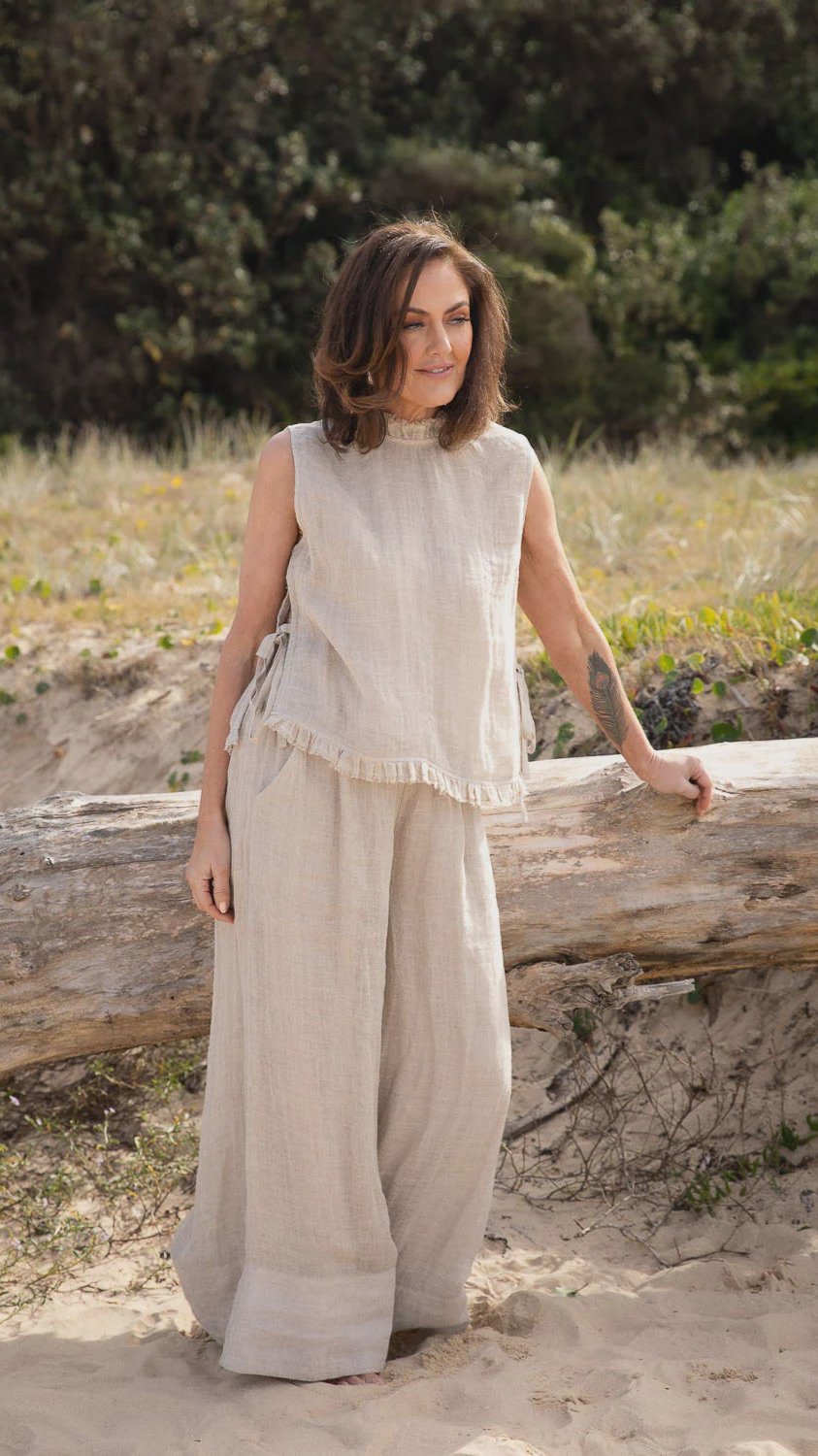 The Arana Linen Pant are a dream to wear. The pant leg is ultra-wide, lined with a soft cotton fabric and falls just below the ankle. Featuring an elasticised waist for comfort, these pants are designed to be worn as mid to low rise.Β