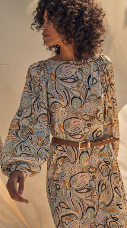 It's crafted from luxurious viscose and designed in a loose silhouette, and the eye-catching and colourful print is an instant head-turner.