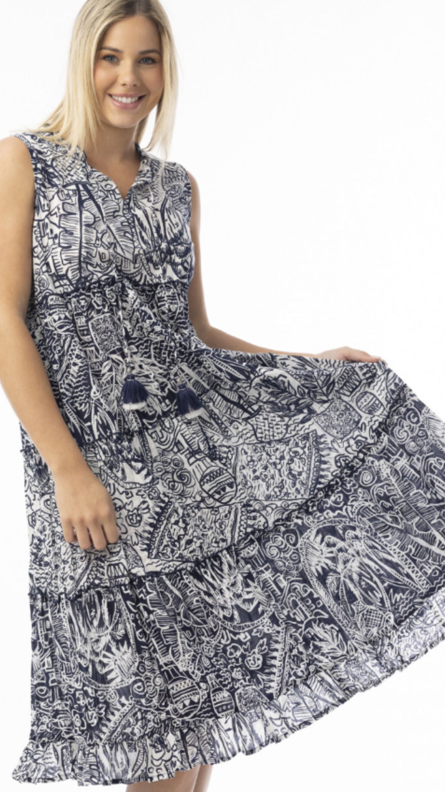 Elevate your summer wardrobe with our radiant Aksharay Navy boho dress. Perfect for beach holidays, this lightweight, colourful piece promises comfort and style featuring a relaxed silhouette, midi-length skirt, and sleeveless design. Ideal for soaking up the sun or sipping cocktails by the sea, this is your go-to for effortless elegance.