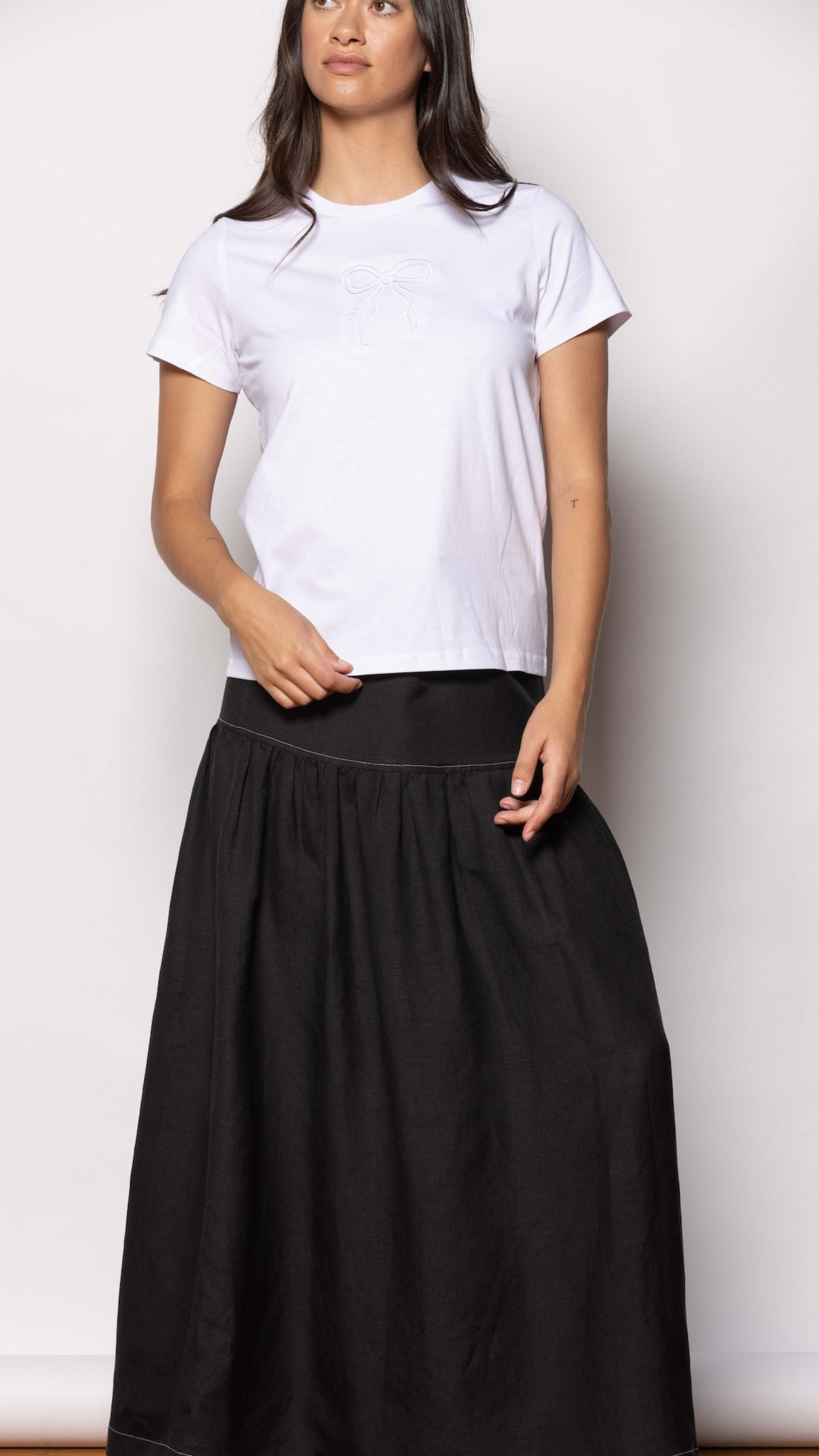 This white Bow T-Shirt features a finely embroidered bow logo centered on the chest, combining subtle detail with classic style.Β