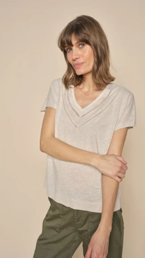 Crafted with a relaxed silhouette, this t-shirt features a trendy v-neck and stylish embellishments around the neckline.