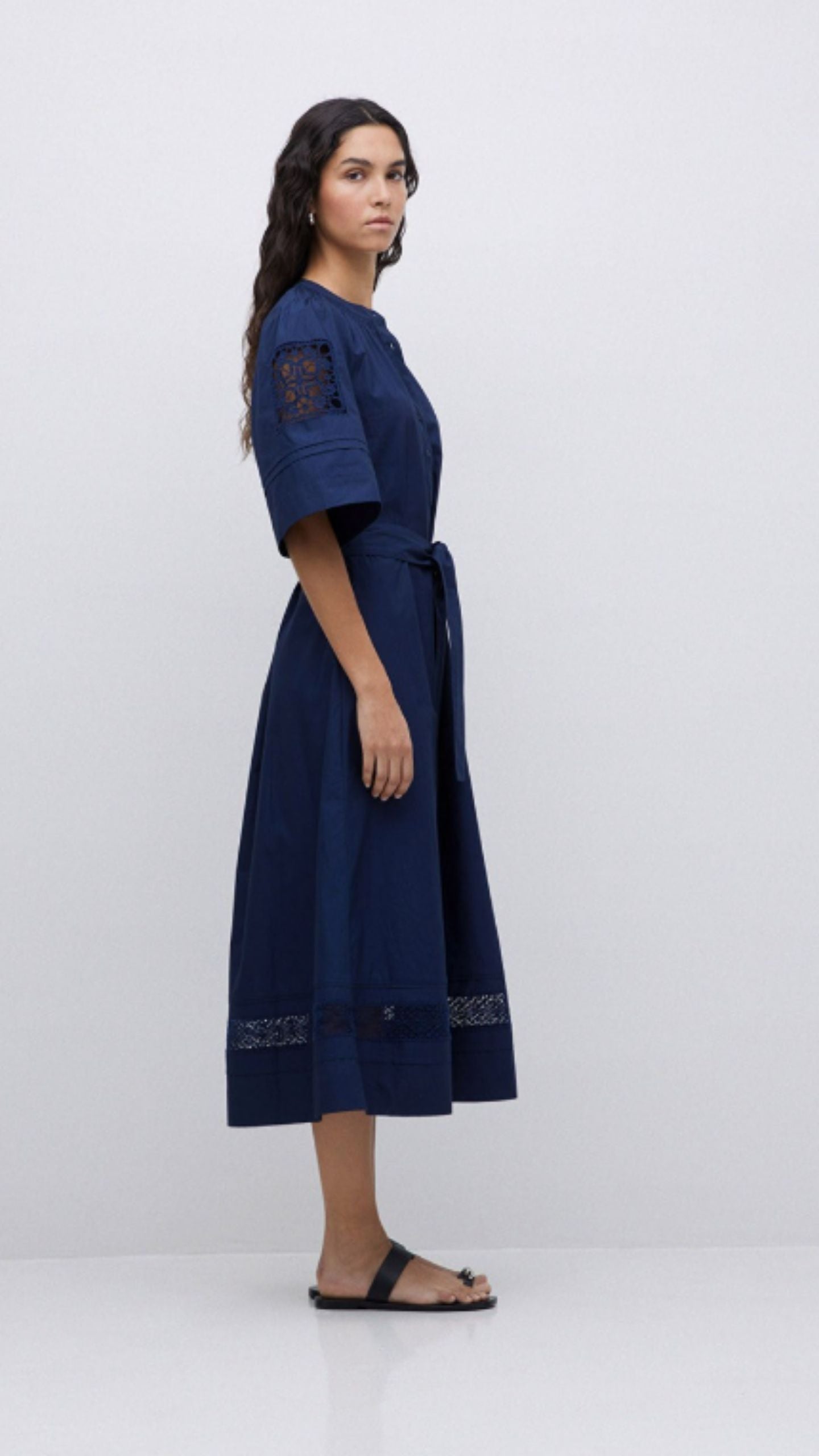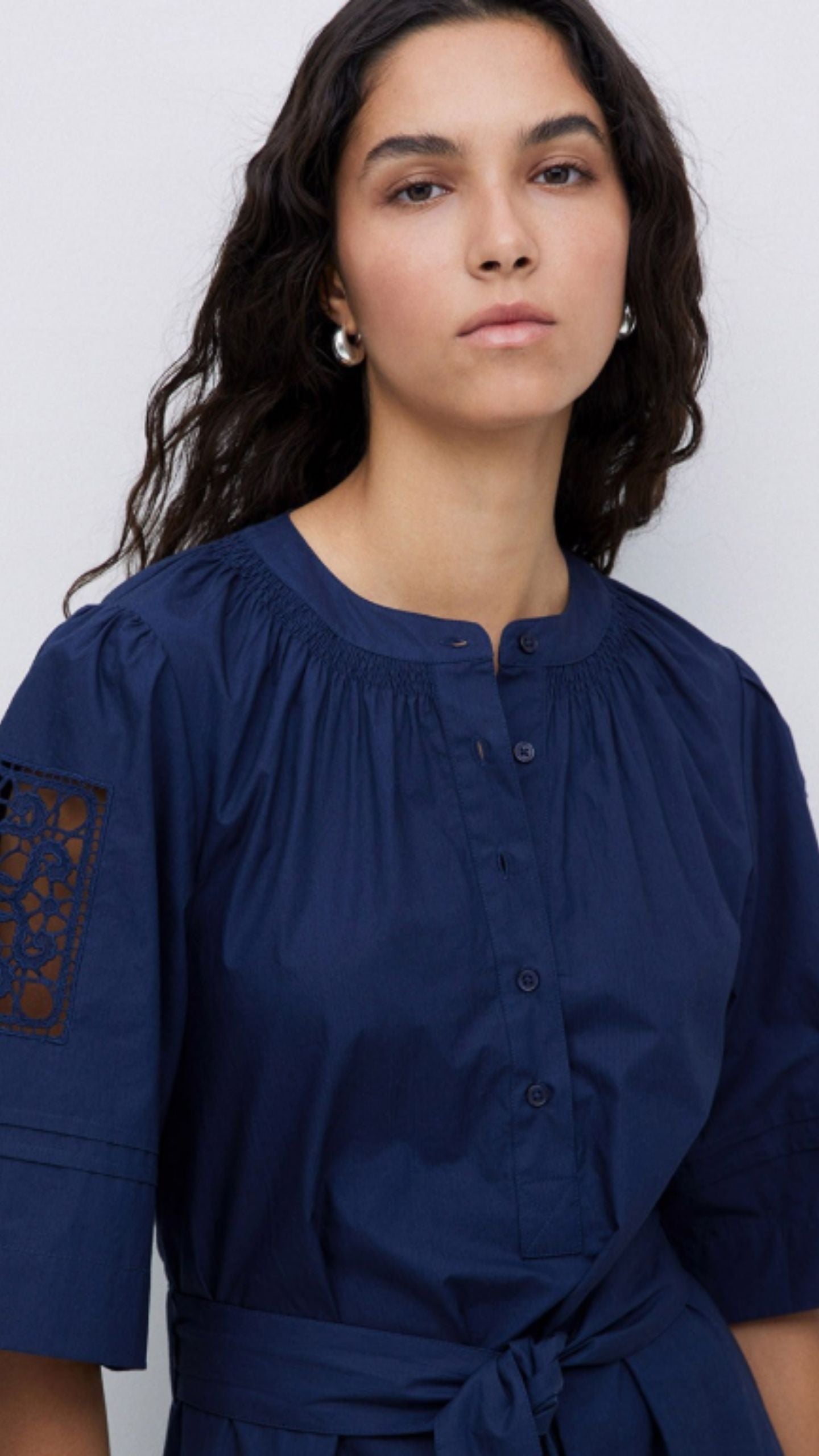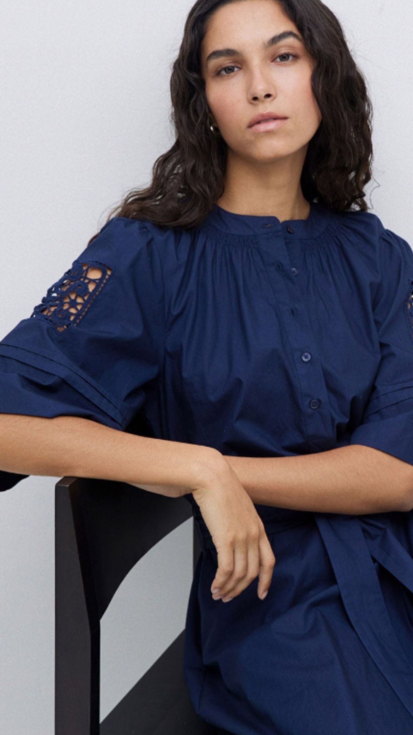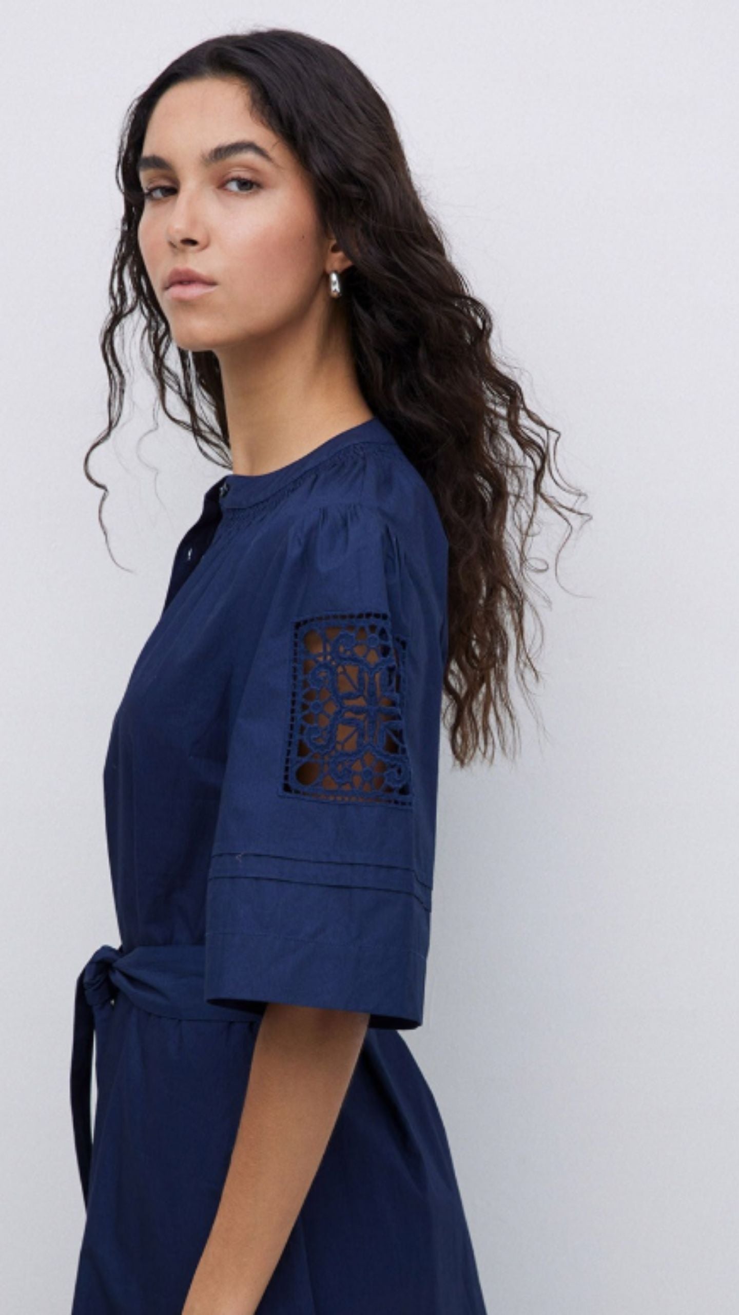 Round neckline with buttons. Short sleeves. Lace-edging detail on sleeves and hem.