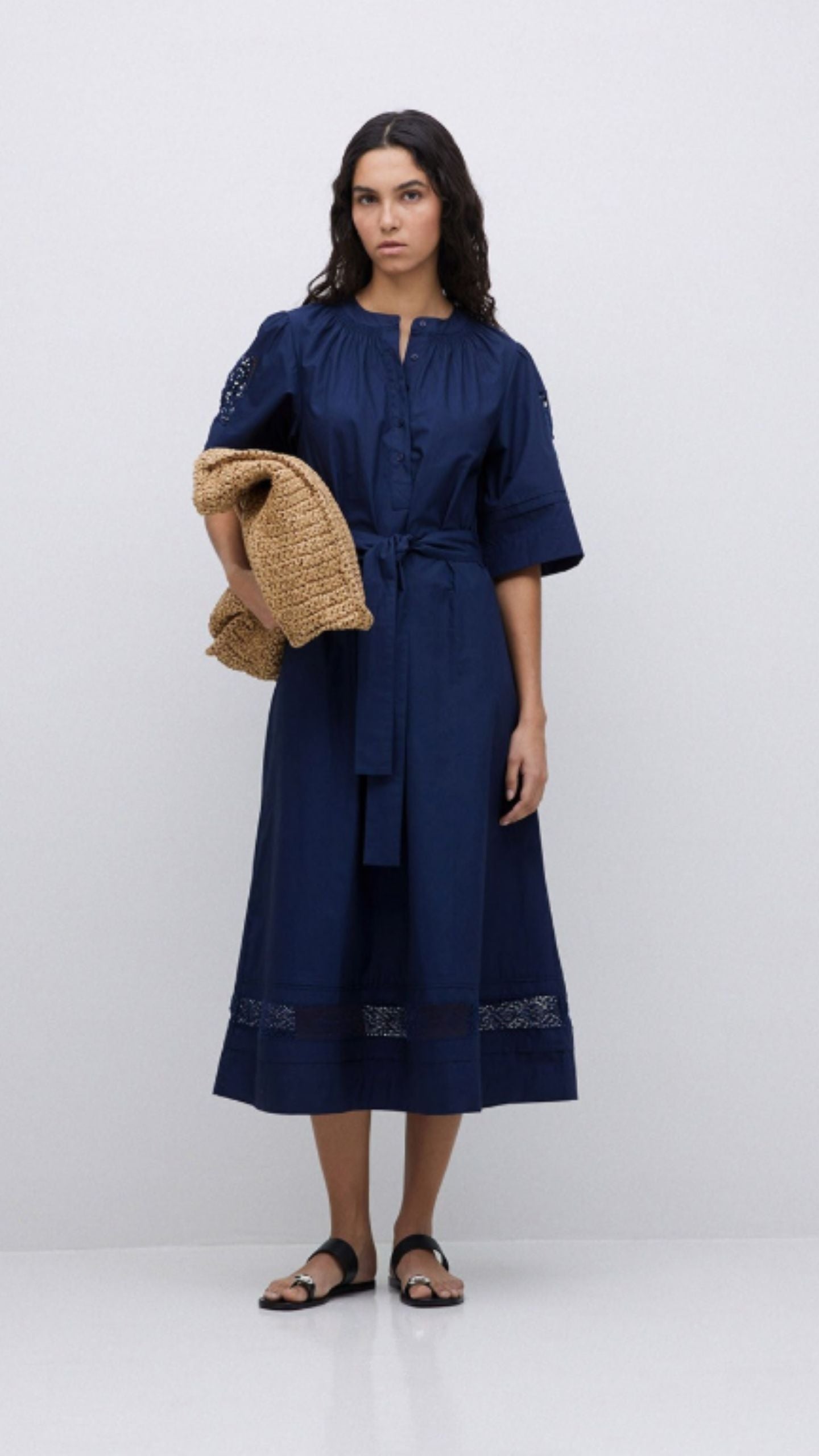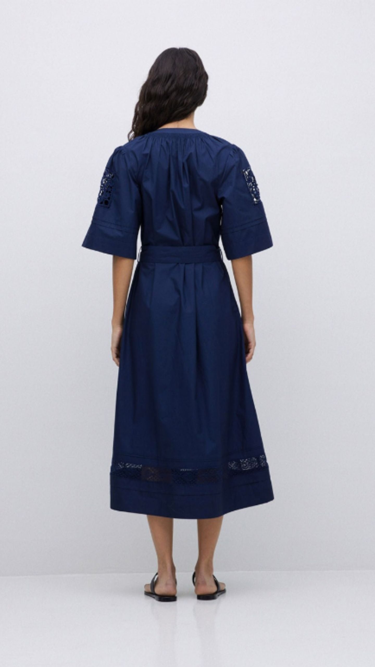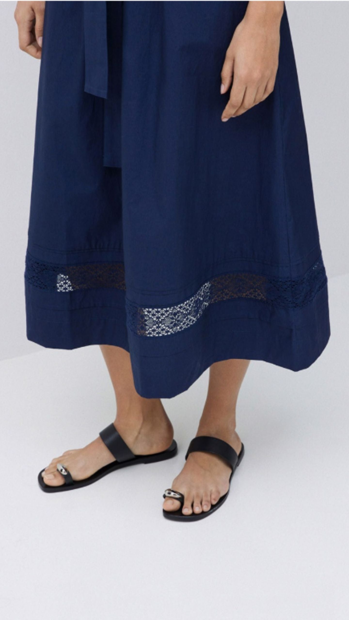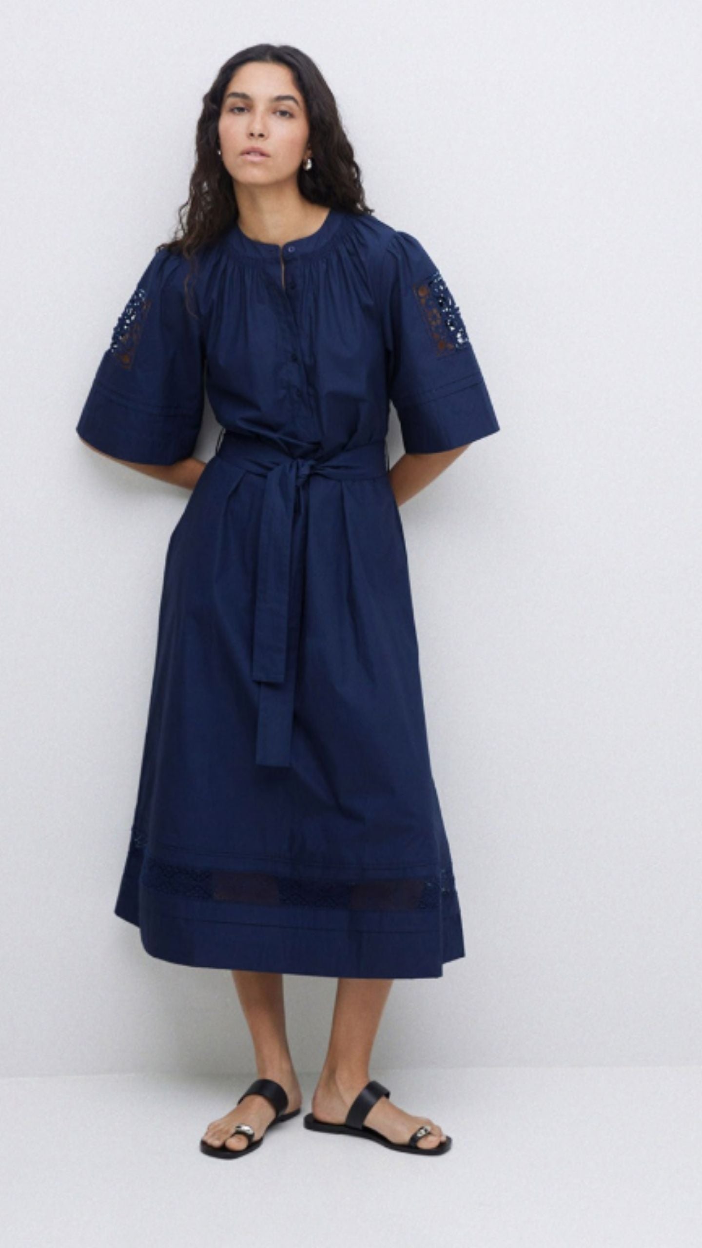 Round neckline with buttons. Short sleeves. Lace-edging detail on sleeves and hem.