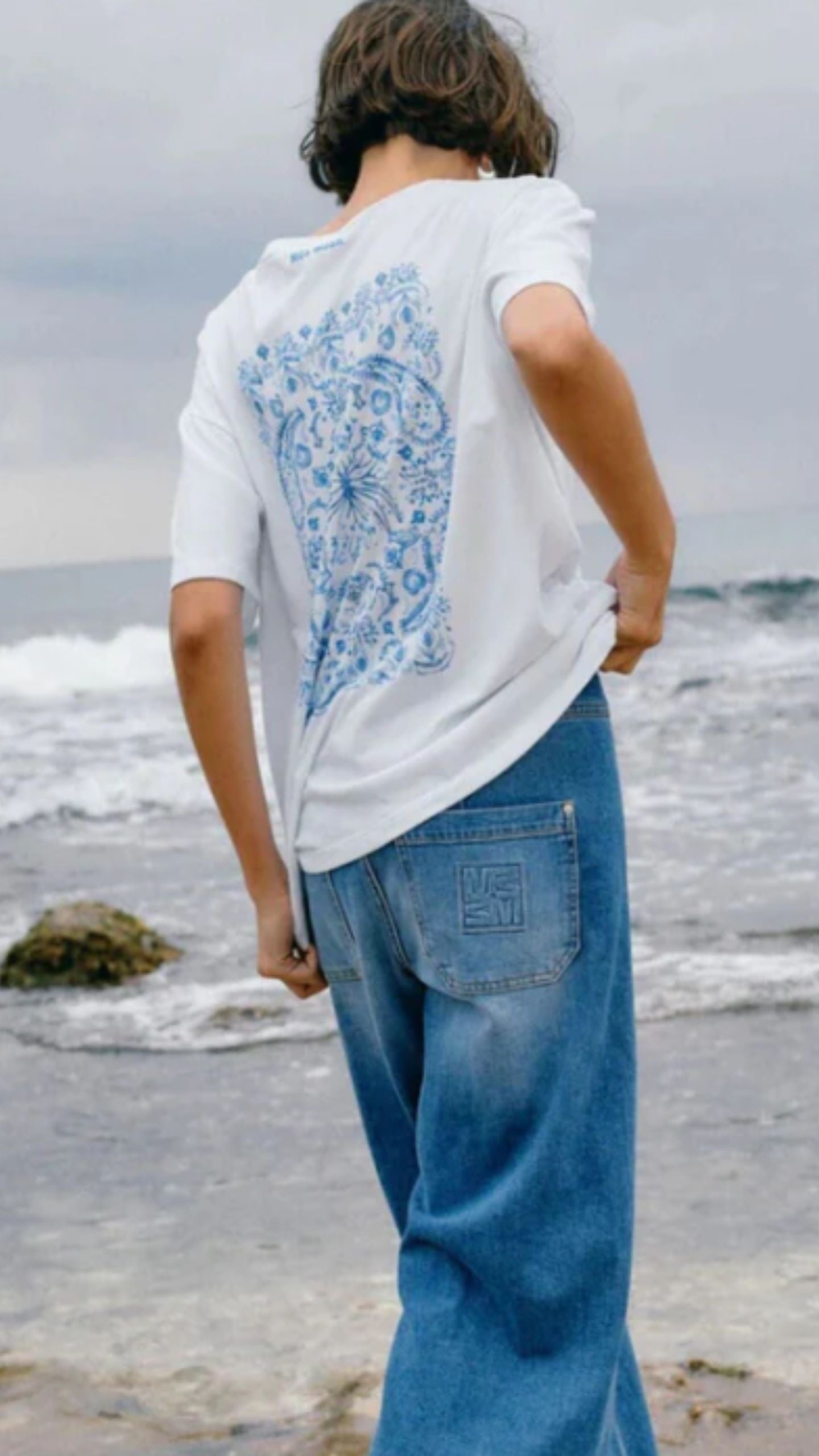 This effortlessly cool oversized tee is a perfect blend of casual style and bold design. Featuring a sleek, minimalistic front, it surprises with a striking and artistic print paired with a logo on the back. The vibrant blue paisley-inspired design is enhanced with dazzling blue rhinestones, adding a touch of sparkle. Perfect for making a statement, this tee pairs seamlessly with loose-fitting denim to nail that relaxed vibe.