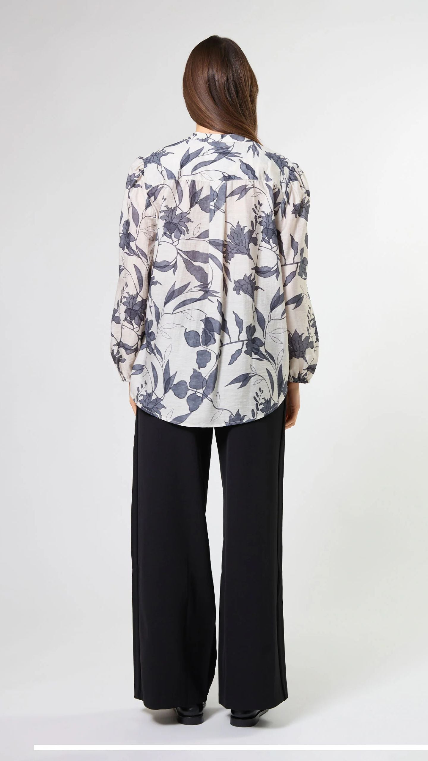 Relaxed fit blouse with mandarin collar, concealed placket and elasticated cuff.
