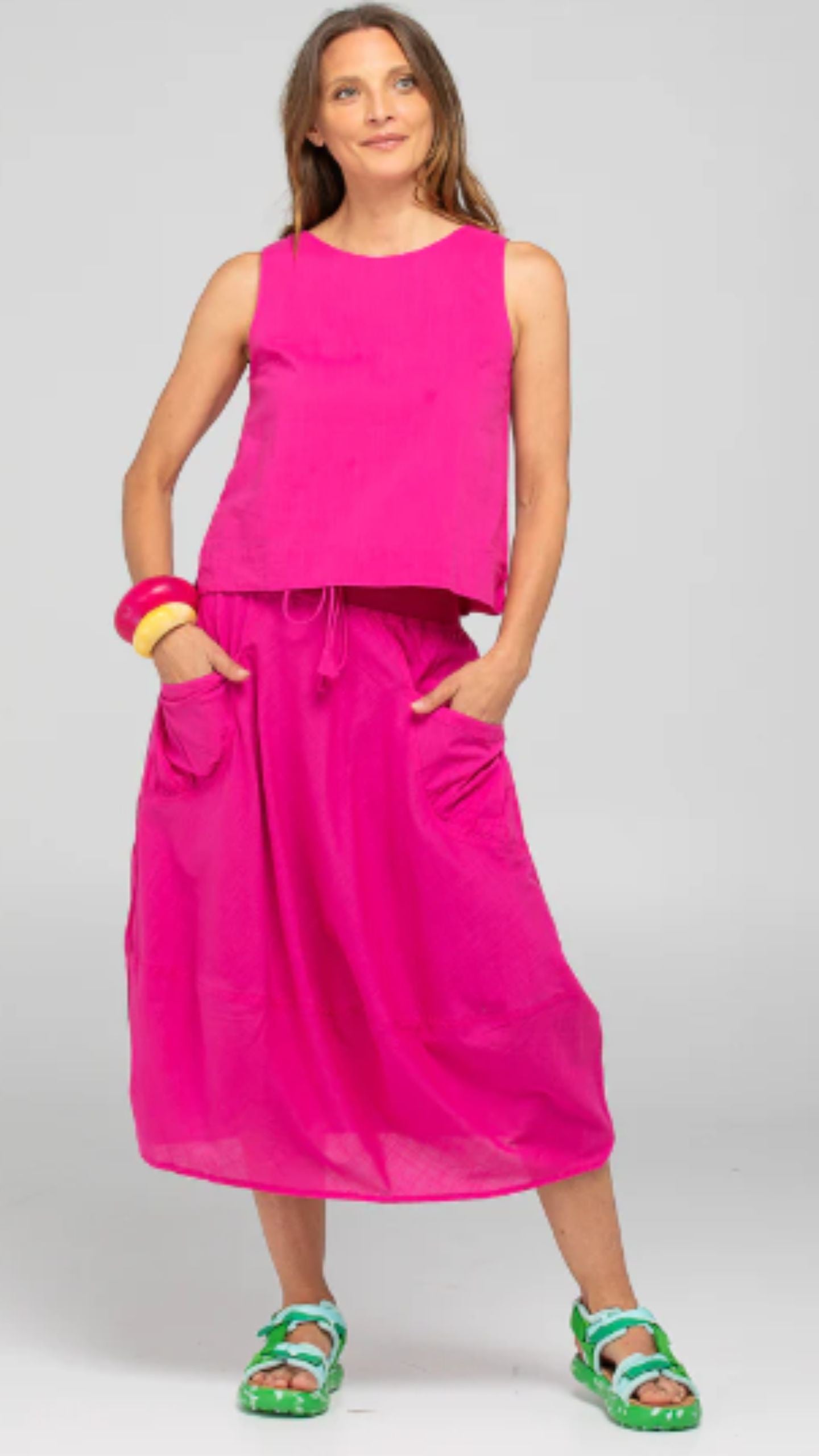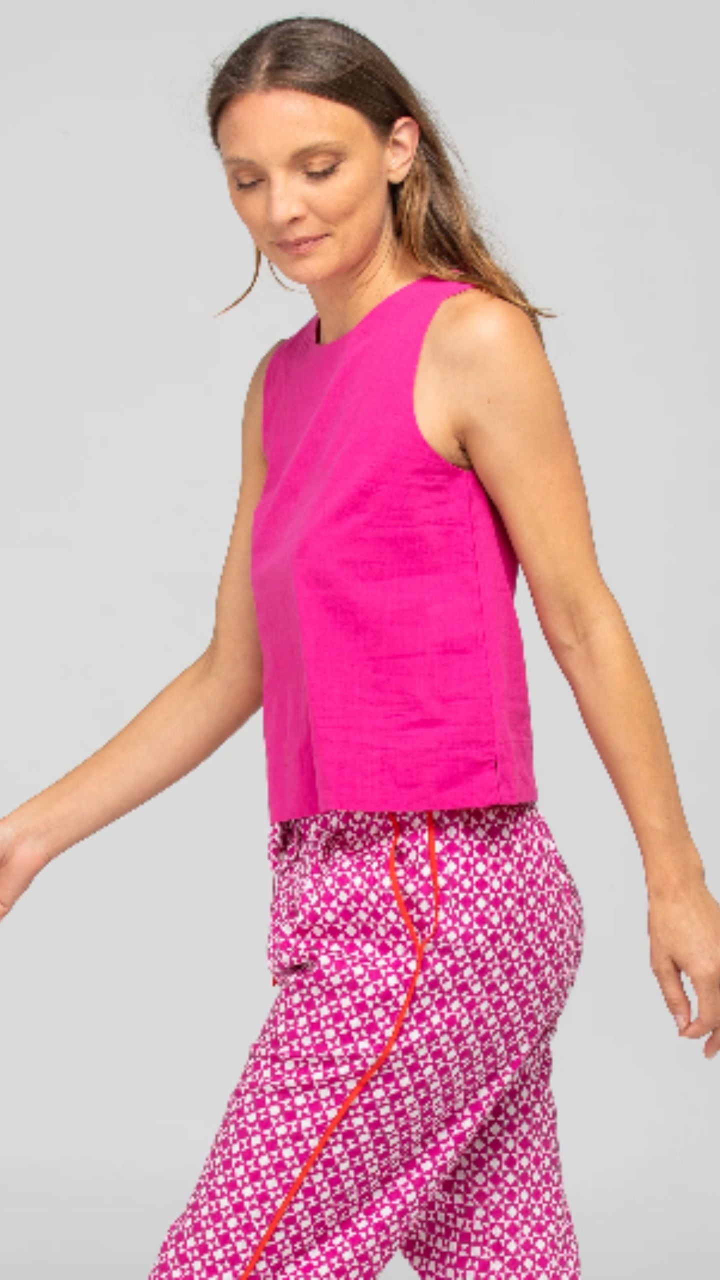 100% cotton, button closure, high scoop neckline, side darts on bust, sleeveless, fully lined.
