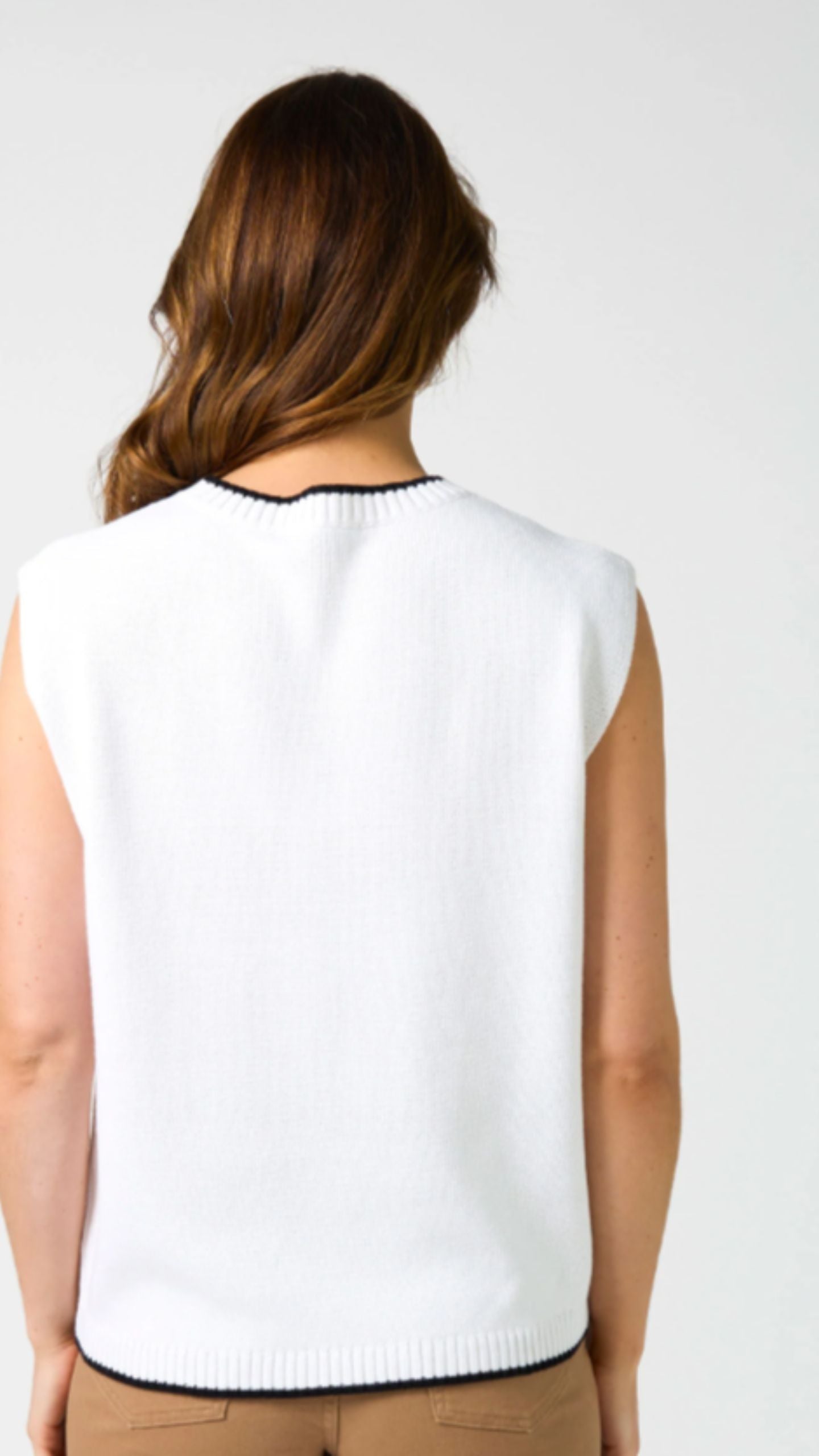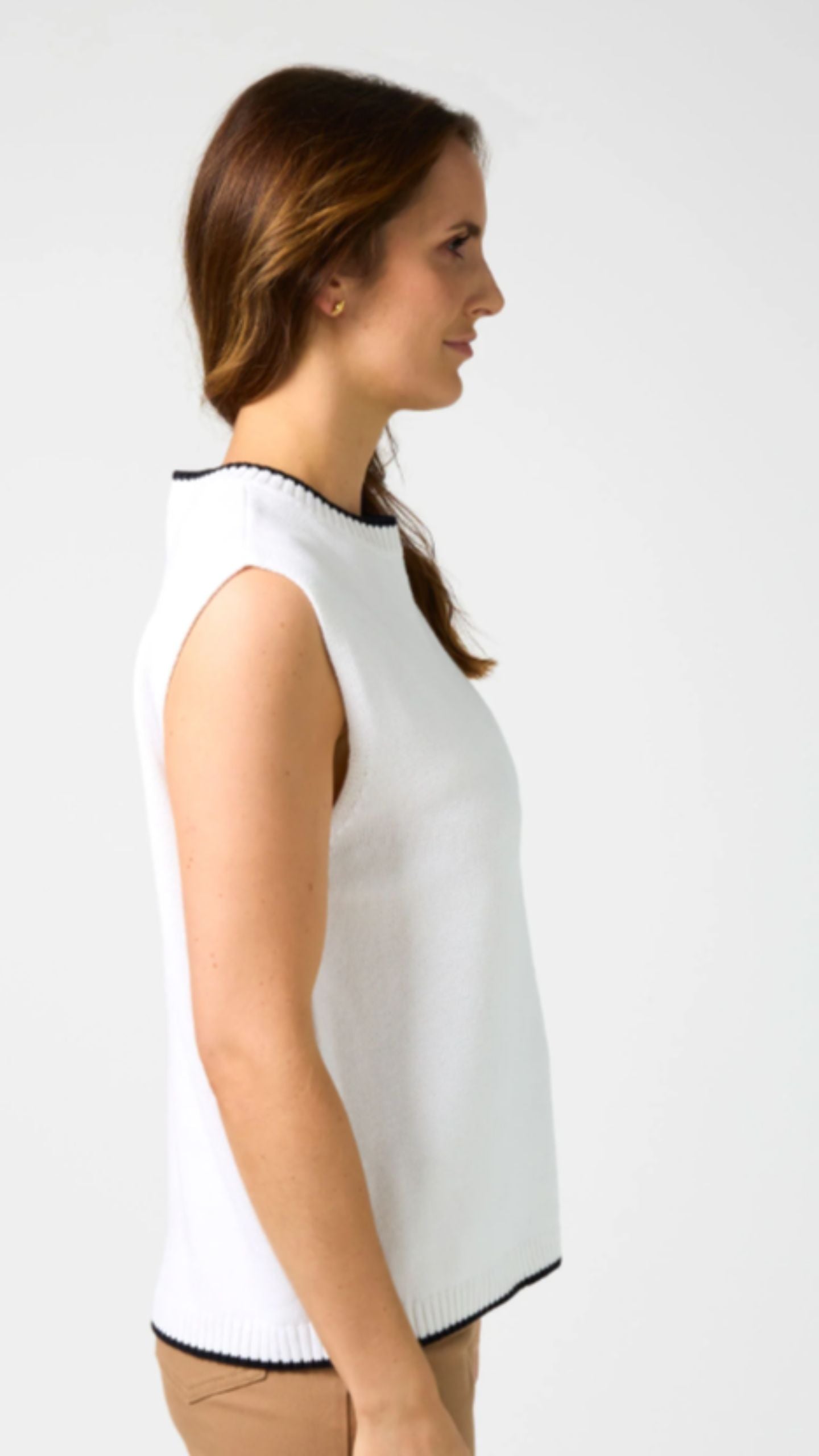 Crew neck sleeveless knit, with jersey body and rib trims and contrast tipping trim on neckline and hem