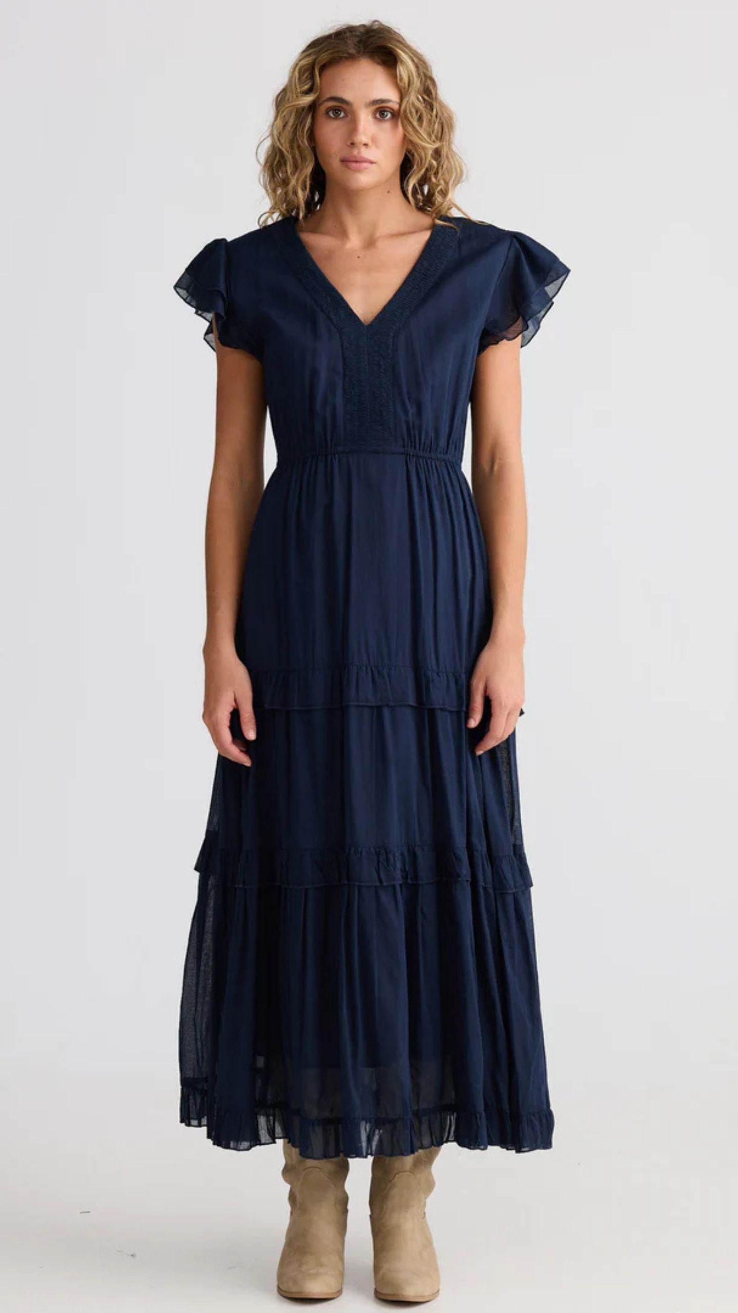 Flutter sleeve, gathered tiers with an elasticated waist.