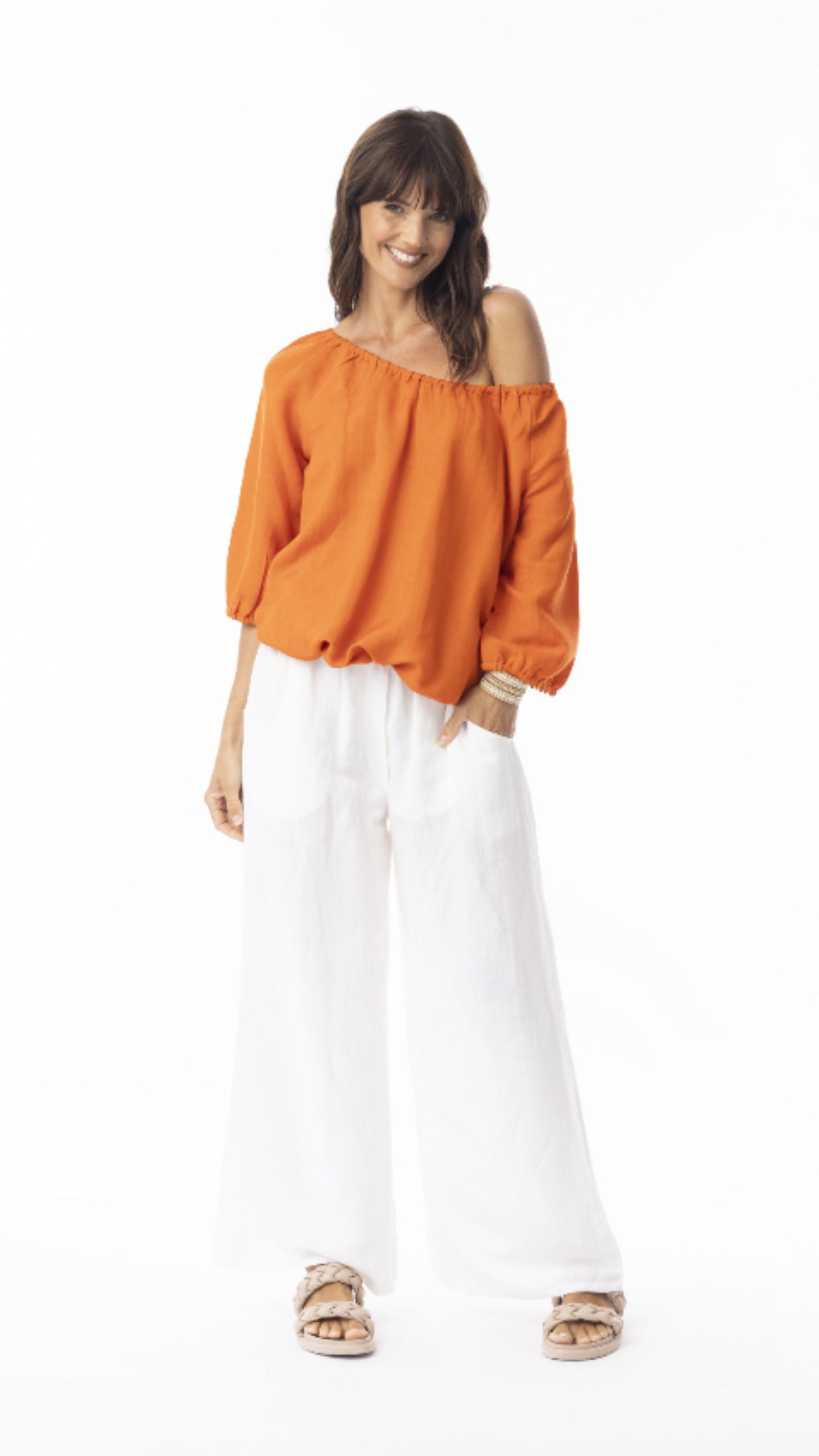This top features a verstile gathered neckline that can be worn on or over the shoulders, and a gathered drawstring hem, allowing you to adjust the height and fit of the top. Pair in a set with our linen pants or mix it up with our gorgeous printed pants.