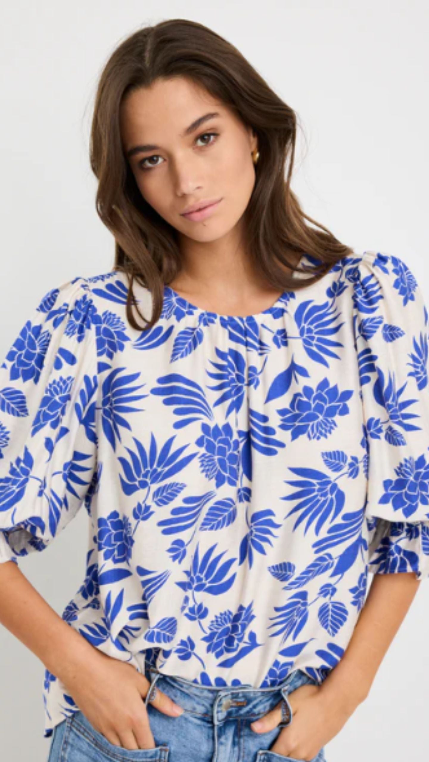 The Justify Top from By Rosa is a breezy, feminine blouse featuring an elegant blue lotus floral print on a soft cream base. Designed with blouson short sleeves that add volume and movement, itβs crafted from a lightweight rayon-nylon blend that drapes beautifully against the body. The relaxed silhouette makes it easy to pair with denim for casual days or elevate with tailored pants for a polished look.