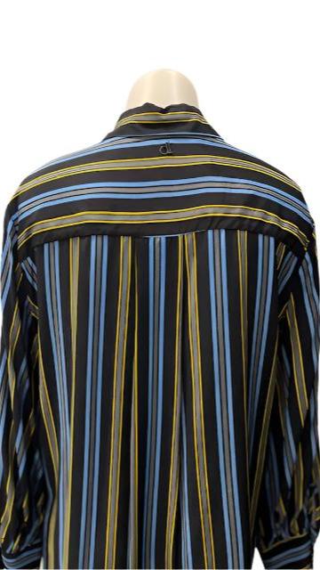 Dark navy striped shirt with sky blue, grey & yellow stripes.