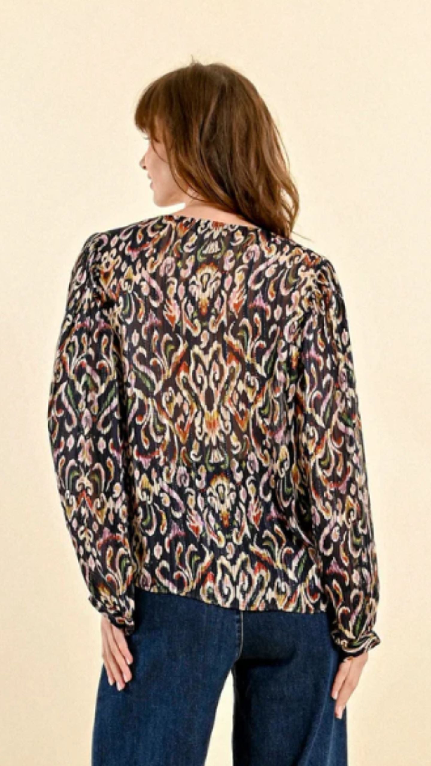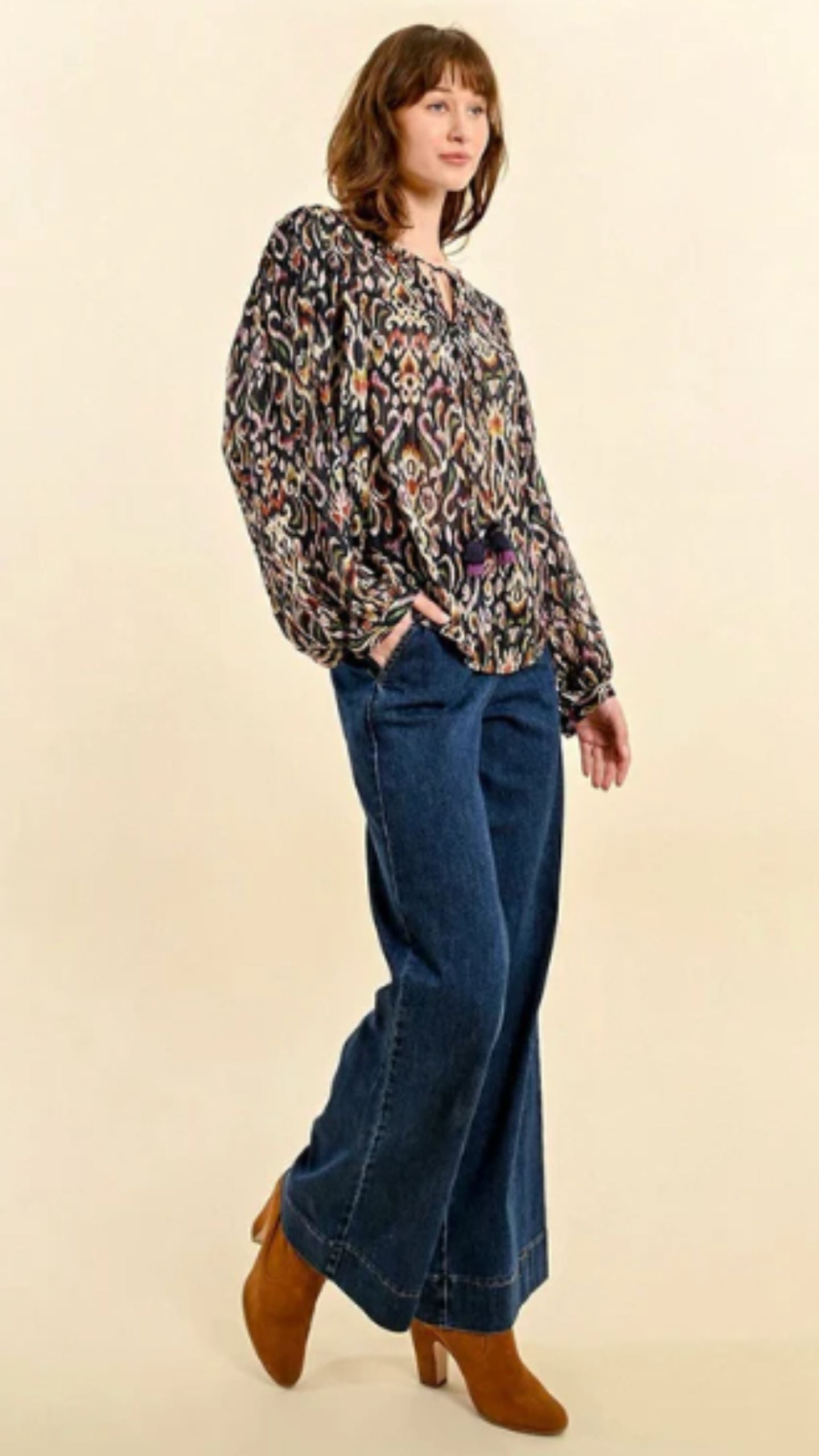 Longsleeved blouse, Puffed sleeves, Round neckline, tie with pompom finish.