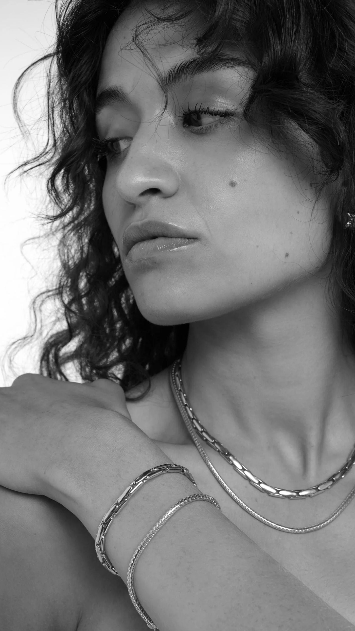 Our collections are made from 98% recycled metals, sourced from our trusted Italian suppliers. Each piece is crafted from a solid brass base, plated with 925 Sterling Silver. Our Gold styles are then plated with a considered, gold-tone finish.