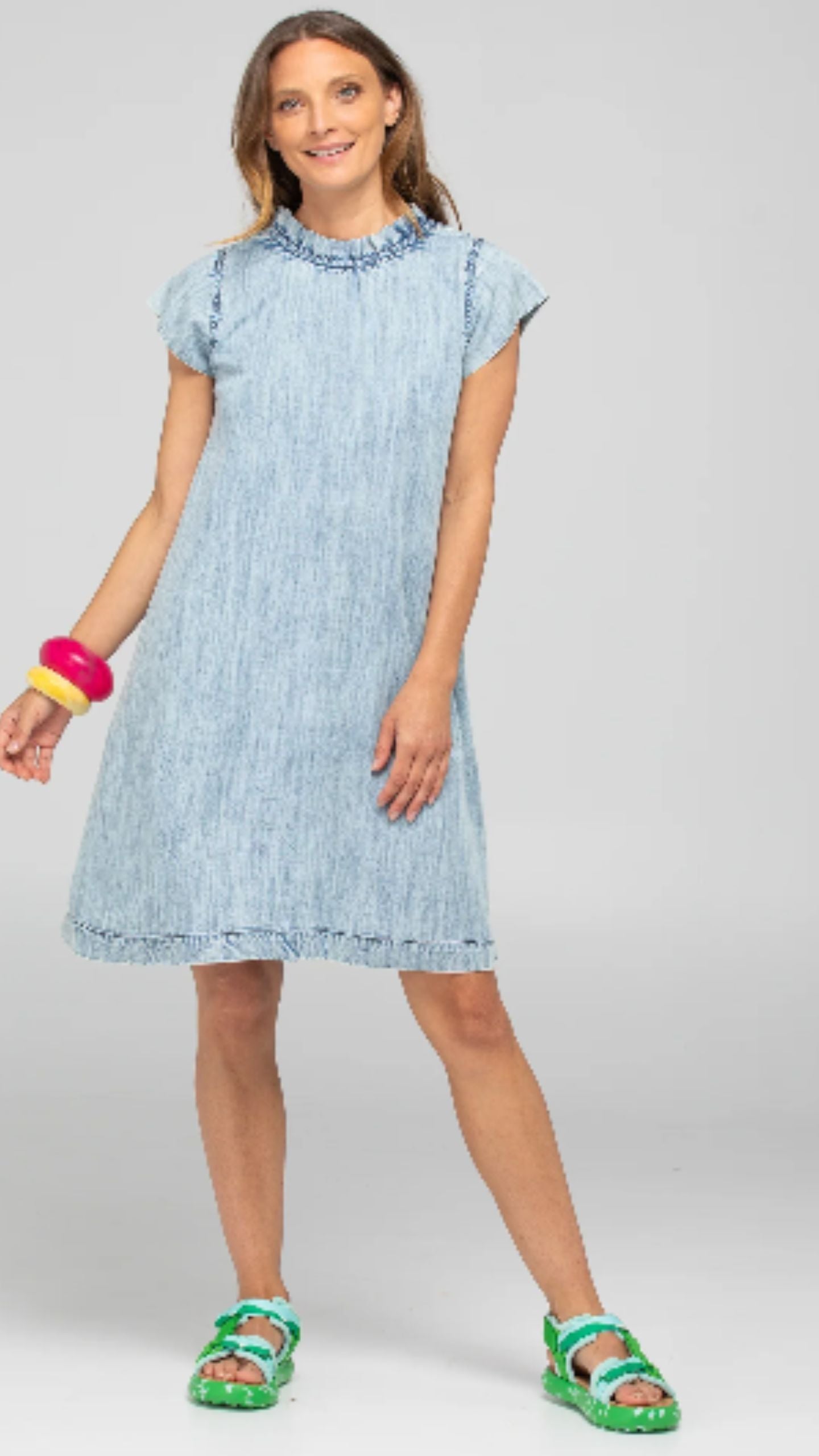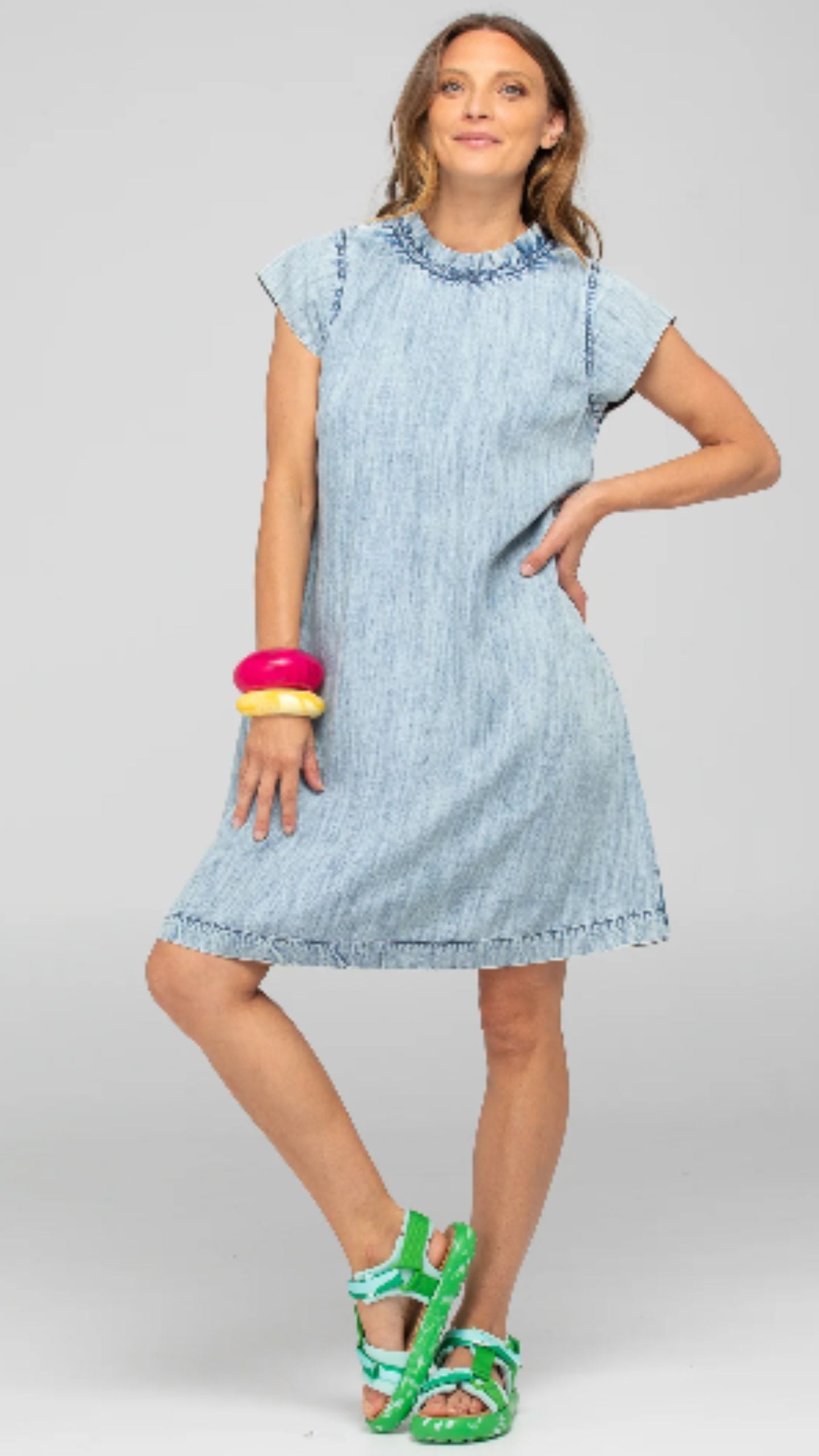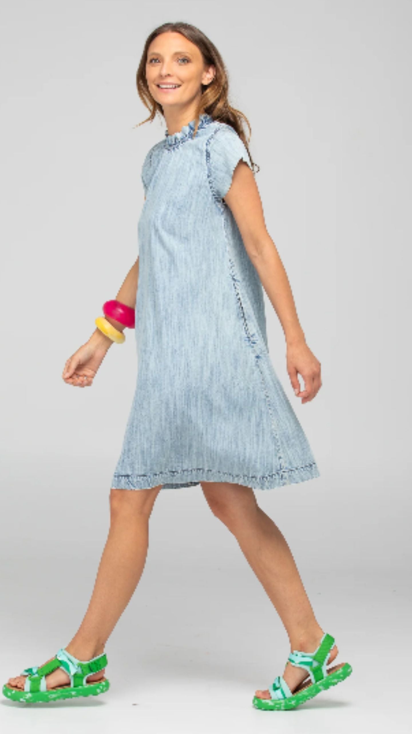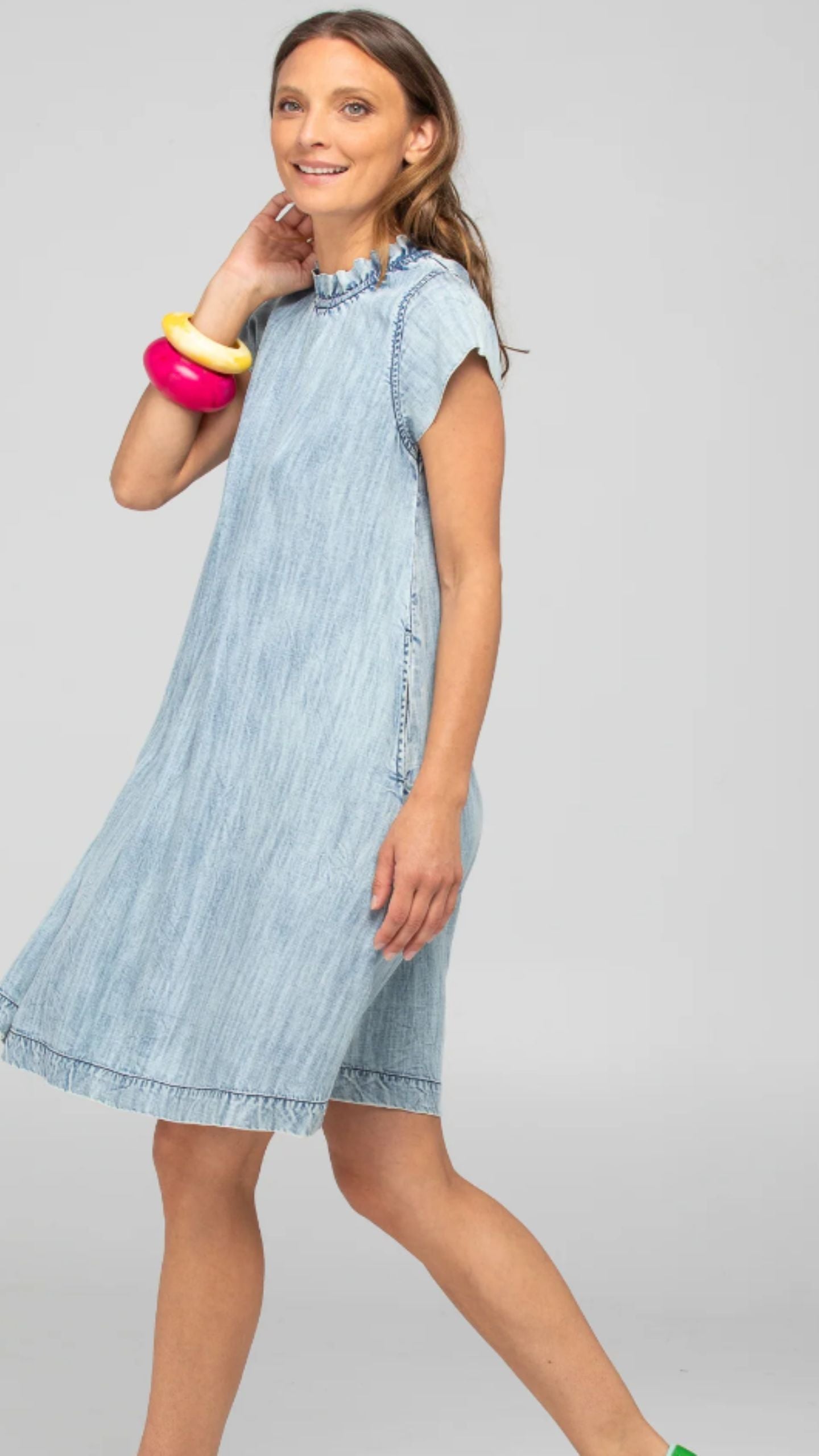 100% lyocell, higher ruffled/gathered neckline, inseam pockets and floaty cap sleeves.