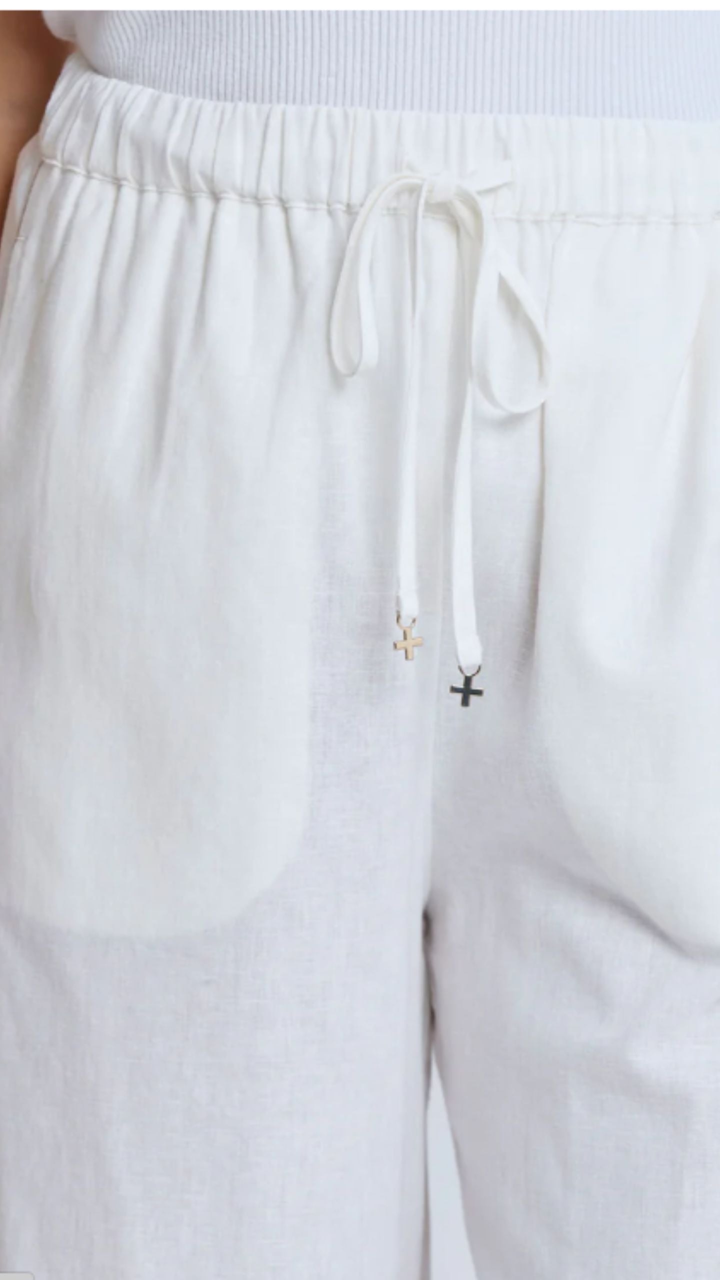 Relaxed fit wide leg cropped pant with fully elasticated waist, self fabric ties with logo pendants and side pockets.