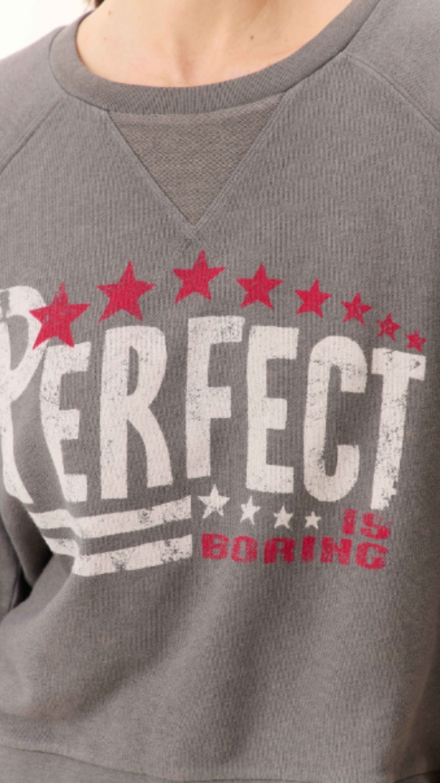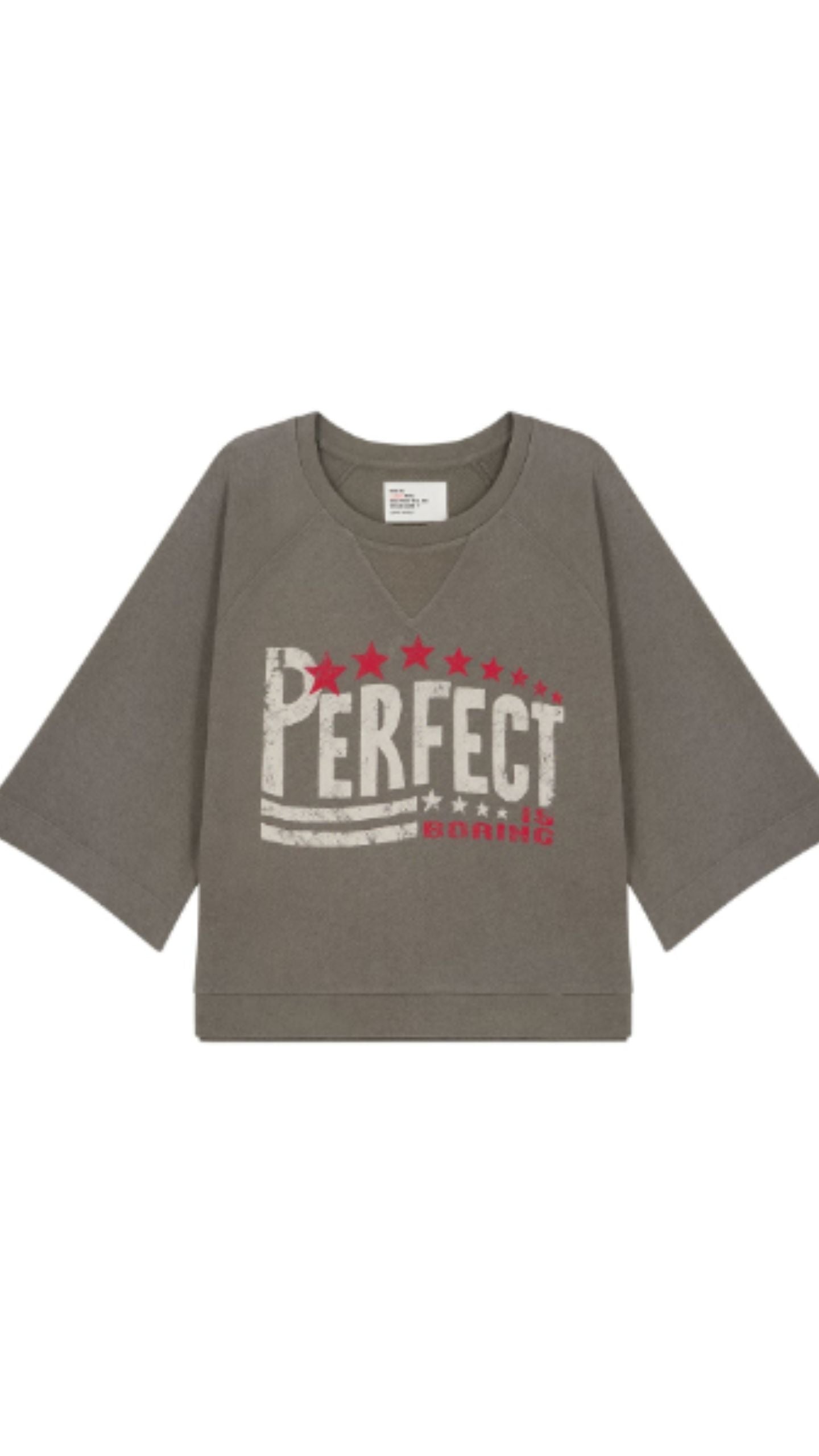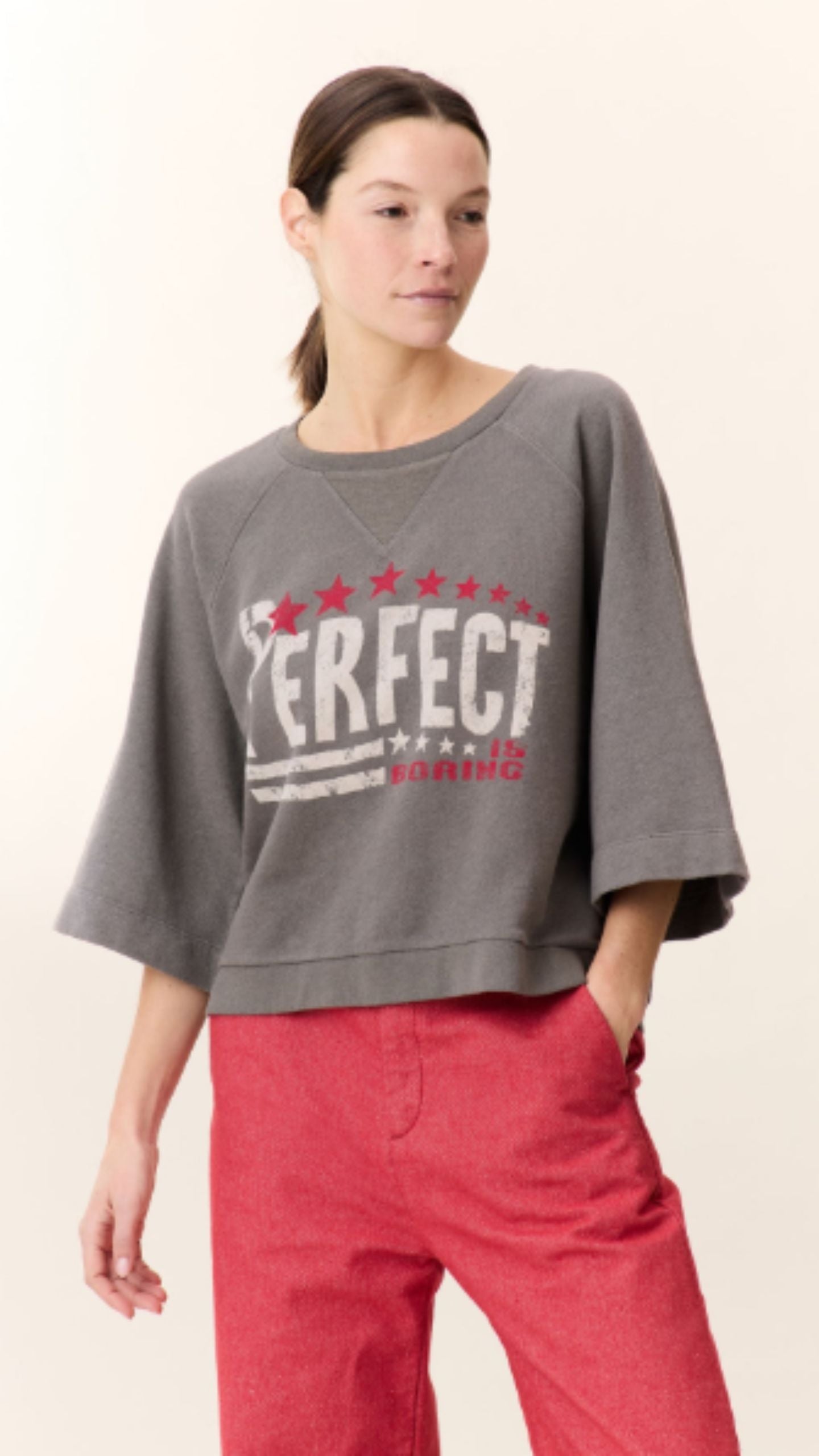It stands out as a key piece with its "Perfect is boring" print, affirming a relaxed and authentic philosophy of the Leon & Harper woman.