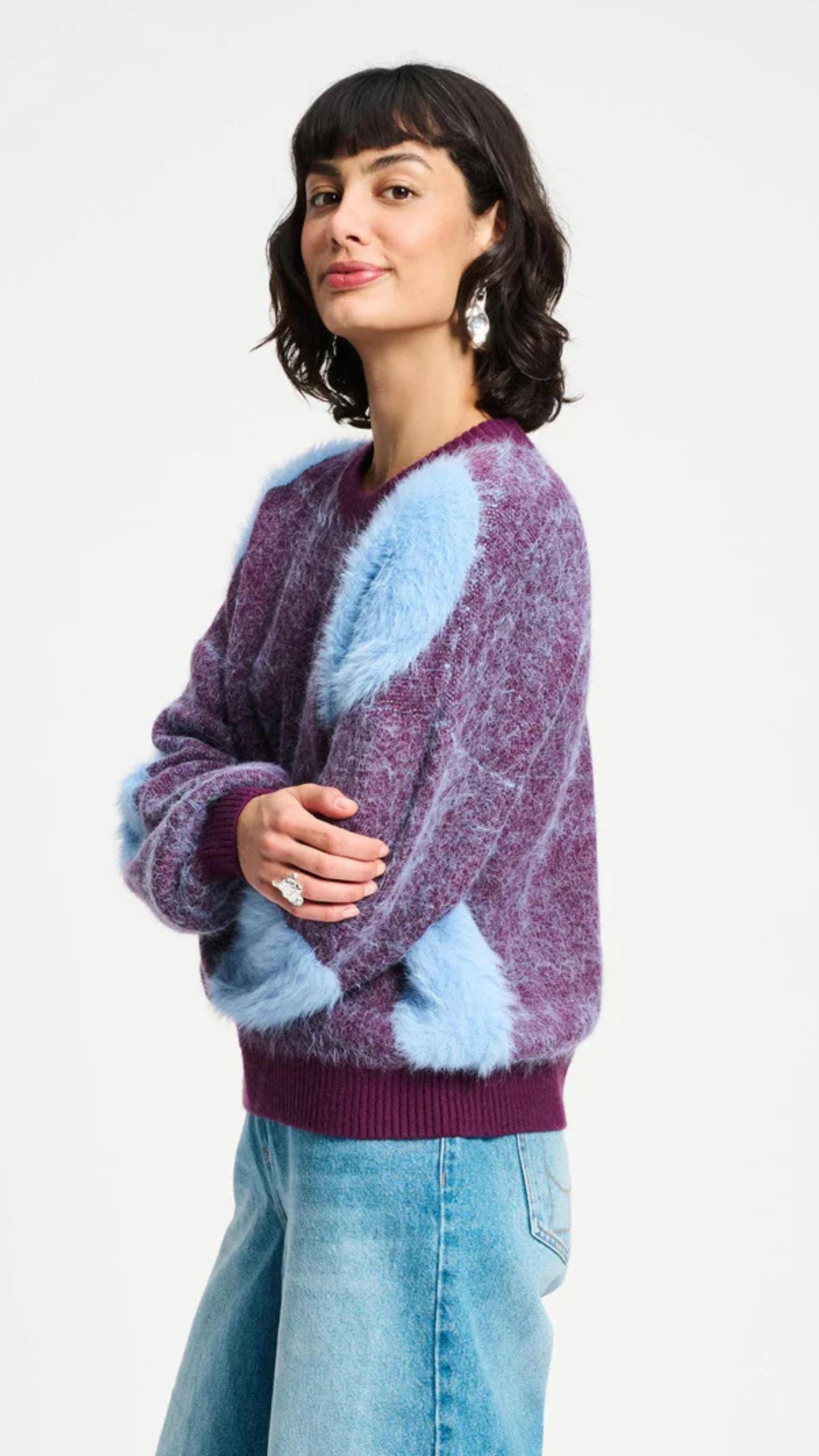 This super soft plum-colored pullover with large blue dots brings together cheerfulness and comfort in one statement piece. Combine the sweater with jeans or trousers for a striking everyday look.