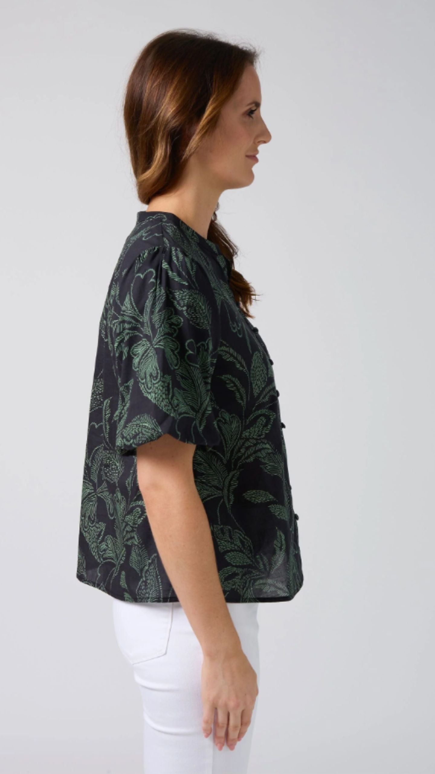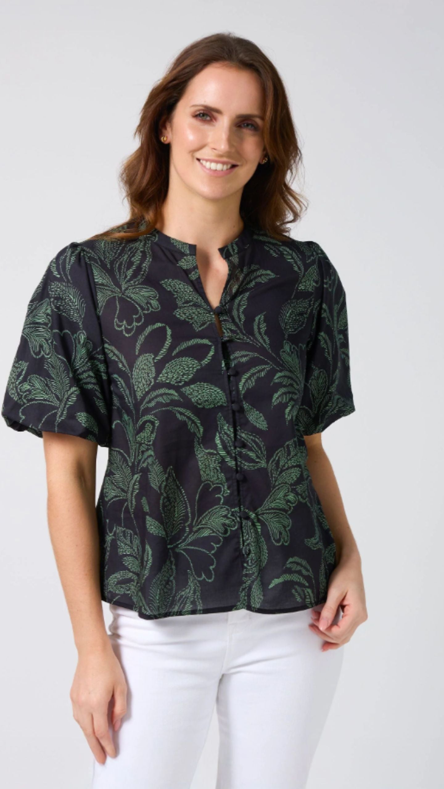- Puff sleeve blouse with mandarin collar and self fabric covered buttons exposed down centre front