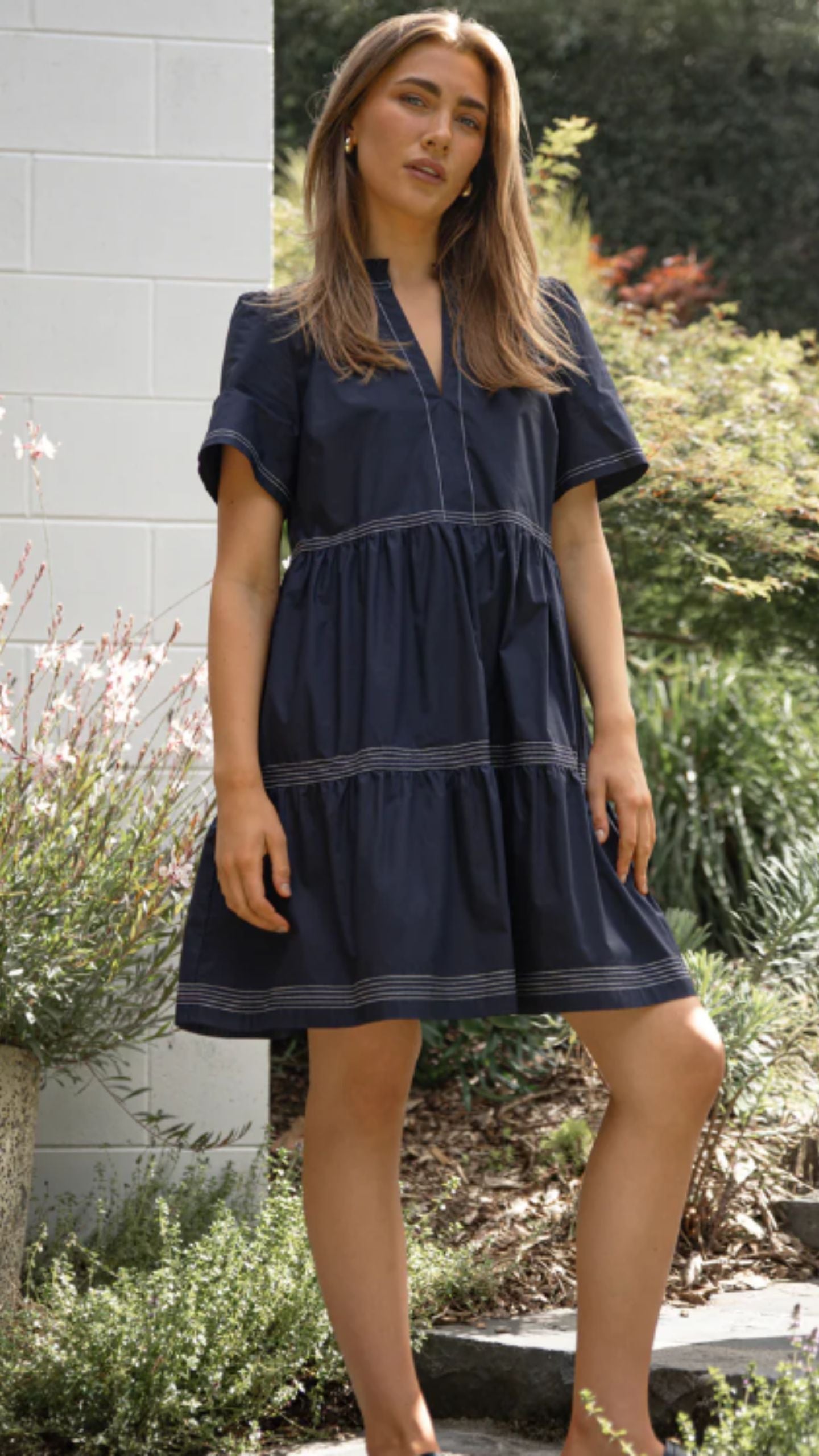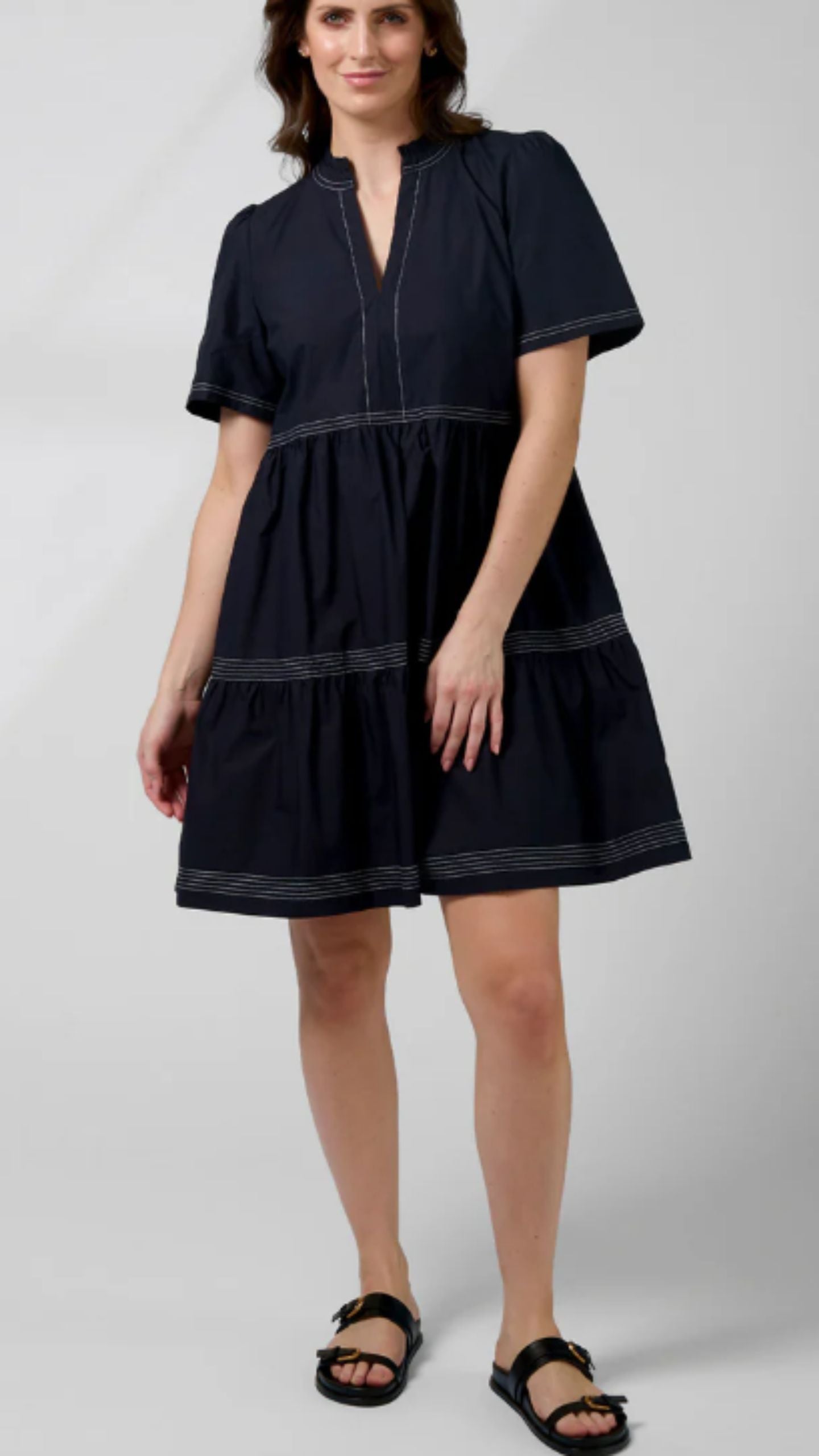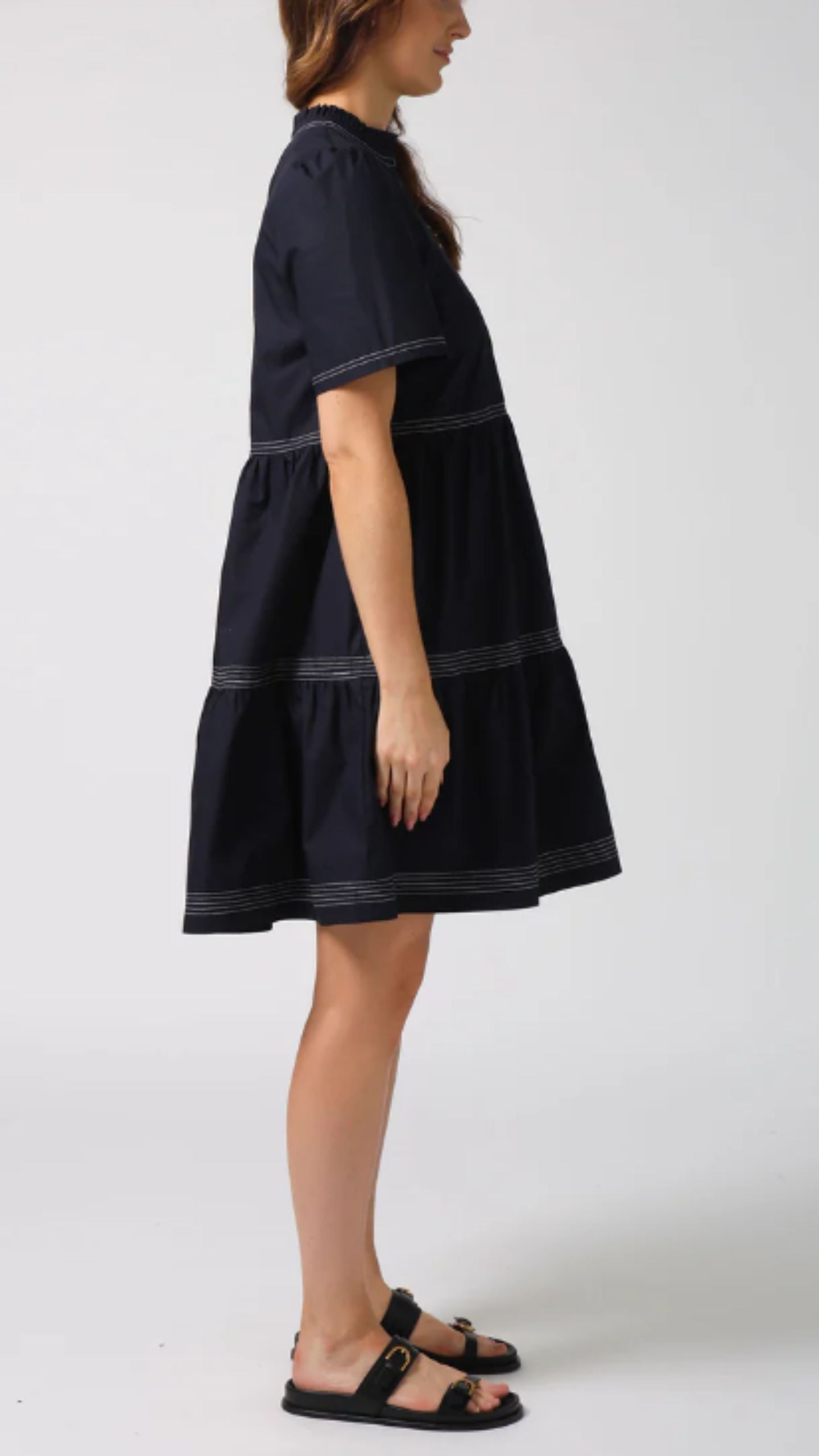 Knee length tiered v neck dress, with ruffle trim on neckline and contrast stitching detail.
