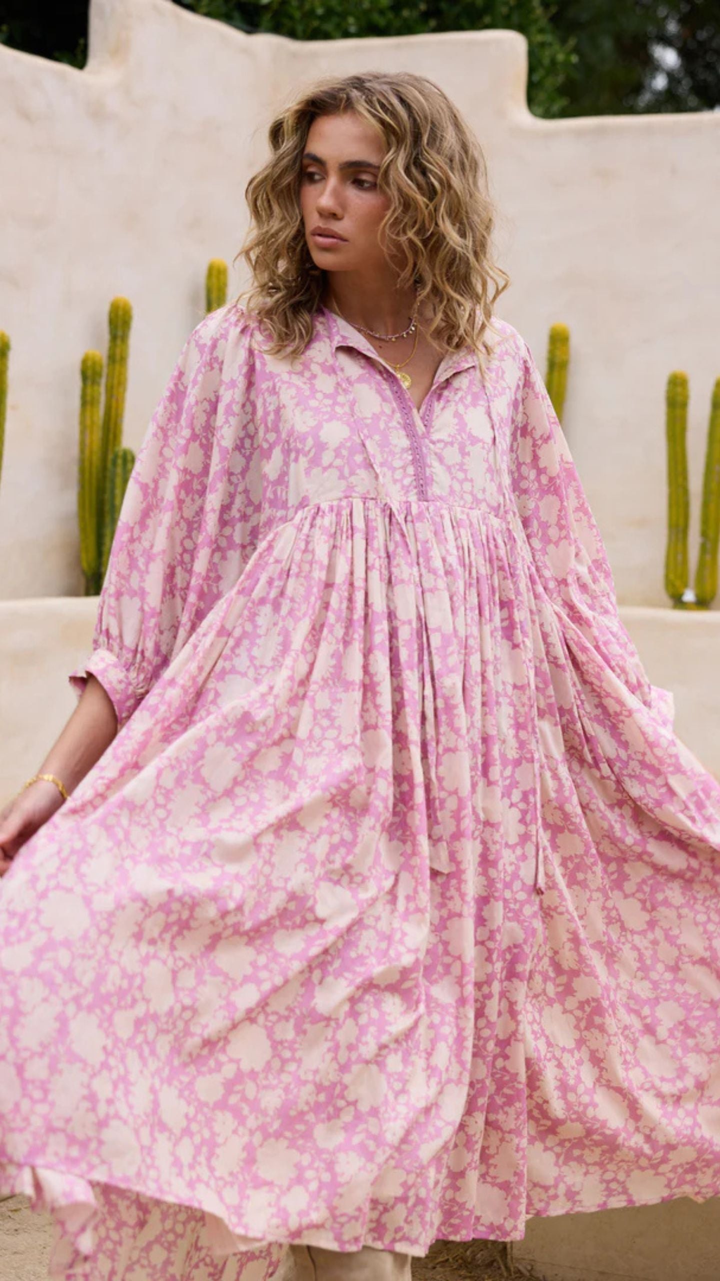 Round neck, relaxed fit dress, with gathered 3/4 sleeve.